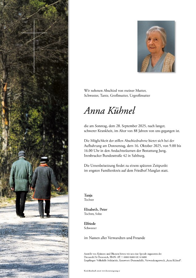 Die Möglichkeit der Abschiednahme bietet sich am Donnerstag, dem 16. Oktober 2025, von 9.00 bis 16.00 Uhr, in den Andachtsräumen der Bestattung Jung.