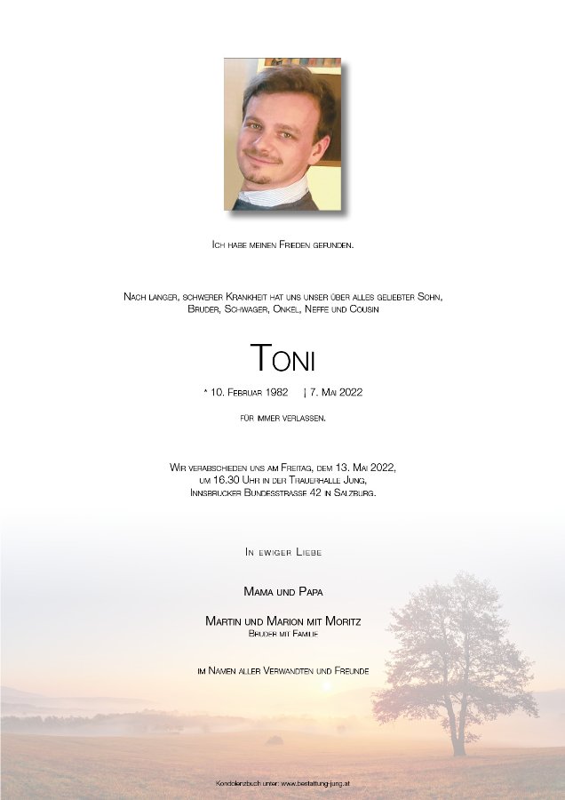 Lieber Toni, kaum jemand kann ermessen, was du mitmachen und erleiden musstest, wie belastet dein Innenleben, deine Seele war.