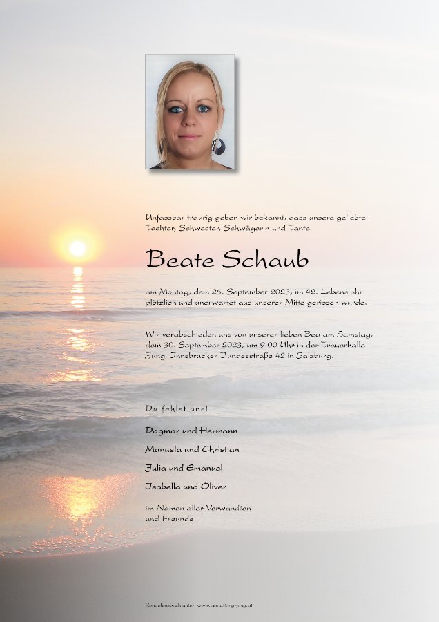 In tiefer Trauer fühlen wir uns mit Euch verbunden. Wir teilen den schweren Verlust mit Euch und senden auf diesem Wege unser tief empfundenes Beileid. In unseren Erinnerungen wird Beate weiterleben.