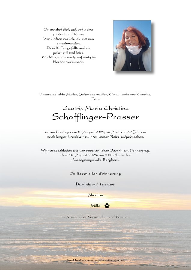 Liebe Beatrix, ich wünsche Dir dass Dich Deine Reise in die Welt führt, die Du mit Yoga immer erkunden wolltest. Obwohl wir uns ewig nicht mehr gesehen haben, habe ich oft an Dich gedacht und erinnere mich gerne an die Volksschulzeit und die Zeit in Bergheim!