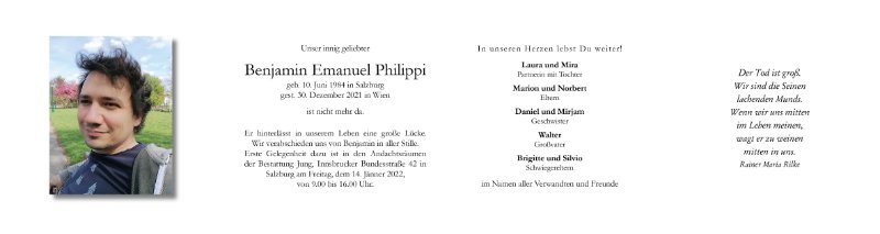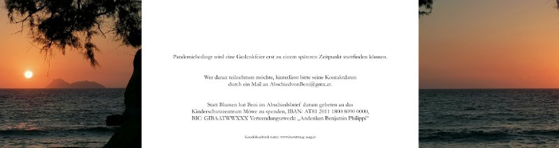 Beni hat darum gebeten an das Kinderschutzzentrum Möwe zu spenden, IBAN: AT81 2011 1800 8090 0000, BIC: GIBAATWWXXX Verwendungszweck: „Andenken Benjamin Philippi“
