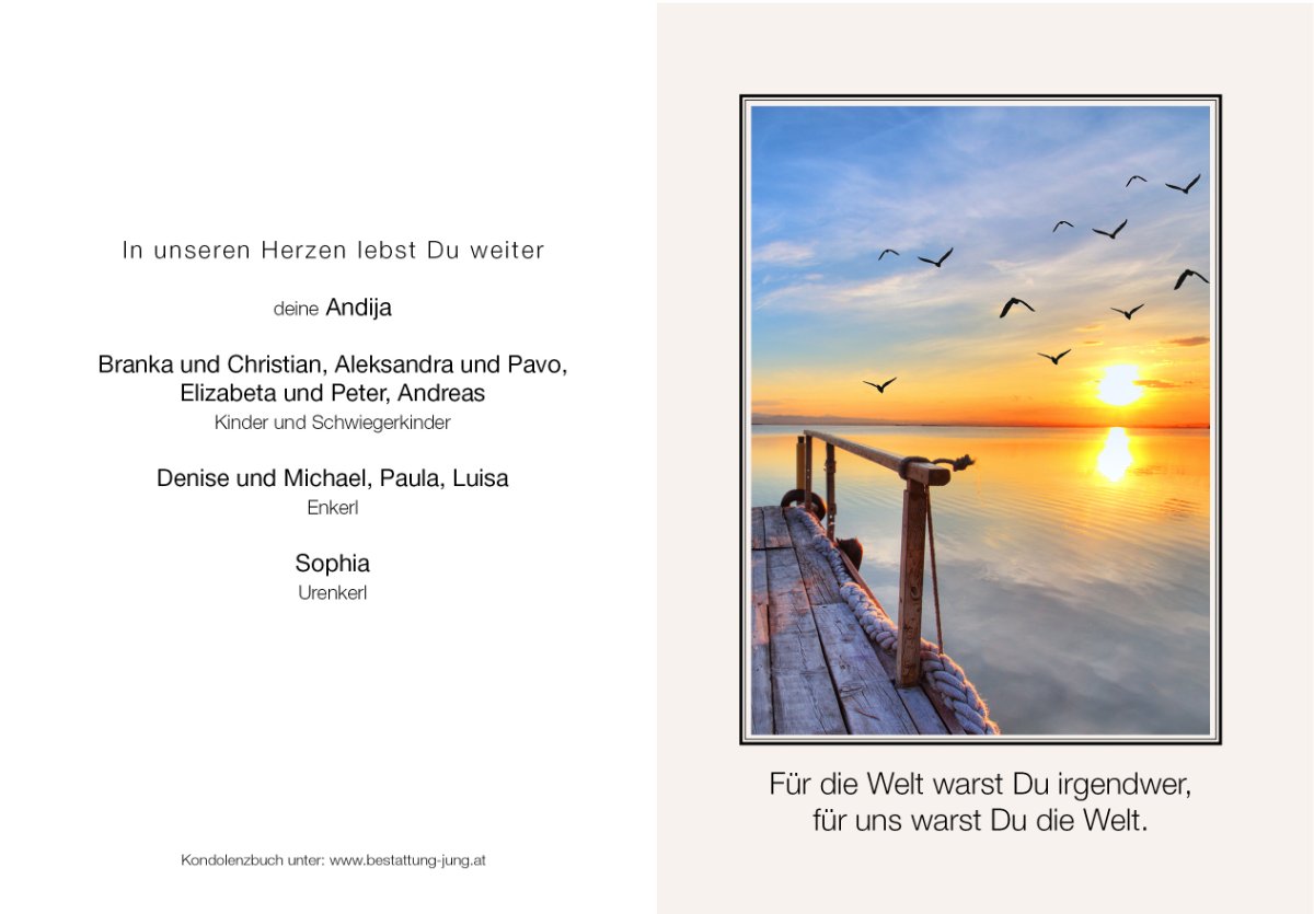 Möge euch die Zeit Heilung bringen, die Erinnerungen eure Tränen trocknen und wieder ein Lächeln in eure Gesichter zaubern.