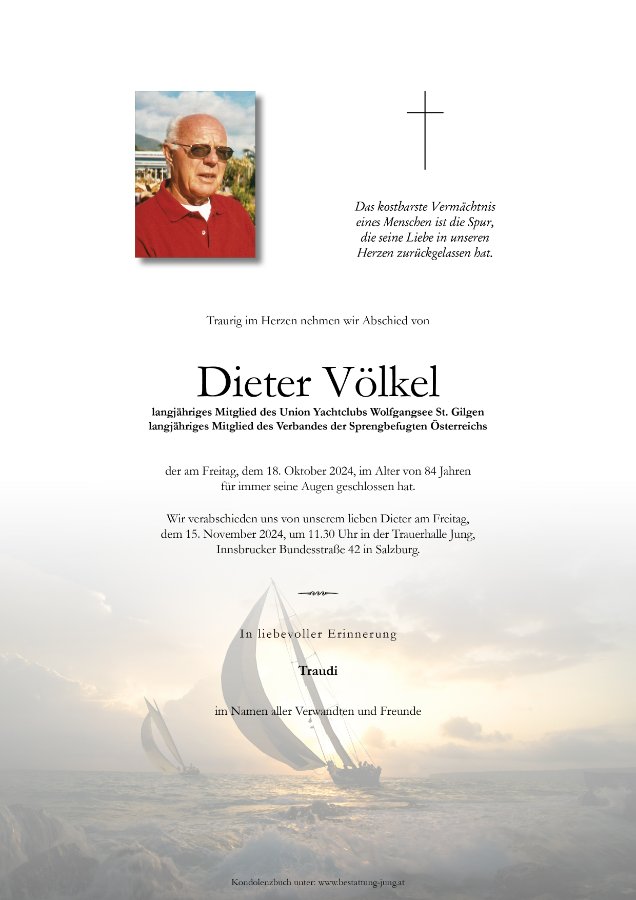 Im Namen des Vorstandes des Salzburger Segelverbandes und auch in eigenem Namen möchte ich Dir unsere aufrichtige Anteilnahme aussprechen und viel Trost und Kraft, besonders in der nächsten Zeit, wünschen. Dieter war ja lange Zeit und bis zuletzt, im Vorstand des Salzburger Segelverbandes aktiv tätig und haben wir ihn nicht nur als kompetenten und freundlichen Vorstandskollegen, sondern vor Allem als Mensch sehr geschätzt.