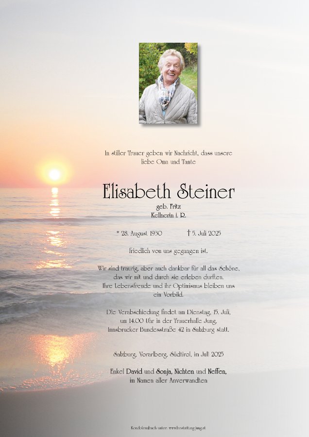 Auch wenn ihr Leben nicht immer einfach war - vom frühen Verlust der Heimat Südtirol in Kriegsjahren, bis zum Tod eines Enkelkindes und schließlich des eigenen Sohnes - war Elisabeth "Liesl" Steiner immer unverbrüchlich optimistisch und in ihren späten Jahren lebensfroh wie keine Zweite.