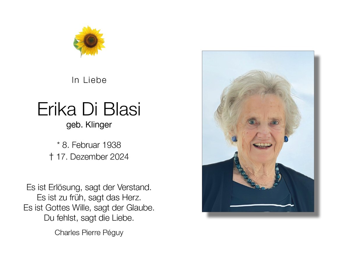 Renate Pühretmair geb Leberbauer aus Haag a. Hausruck. Meine Eltern waren damals in Mondsee wohnhaft und wurden dort mit Frau Leiminger (Mutter von Erika Di Blasi )bekannt und bald entwickelte sich beste Freundschaft. So lernte ich , Renate durch meine Eltern, Erika kennen und wir waren bis zum Ableben von Erika in bester Freundschaft und telefonischer Verbindung. Ich Renate werde diese Freundschaft immer in dankbarer Erinnerung behalten . Ich kann leider am Begräbnis von Erika nicht teilnehmen. Liebe Erika Ruhe in Frieden!