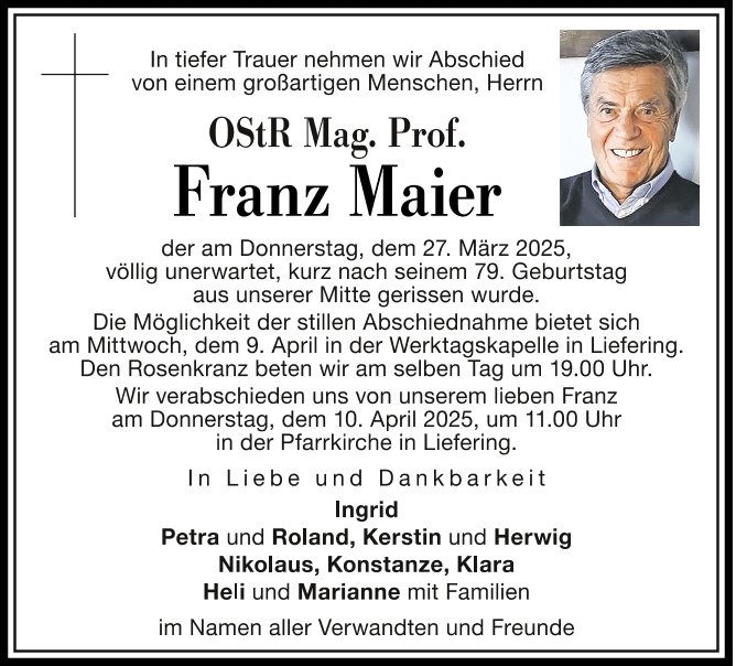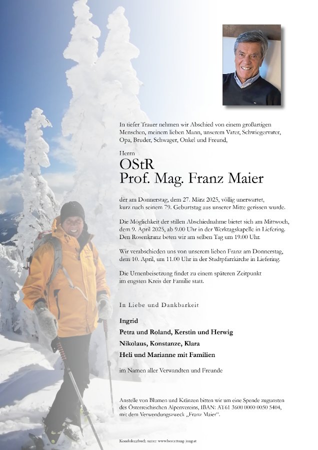 Obwohl ich OStR Prof. Mag. Franz Maier nicht mehr Kennenlernen konnte möchte ich Familie im Namen des ÖKB Liefering unser Beileid ausdrücken.