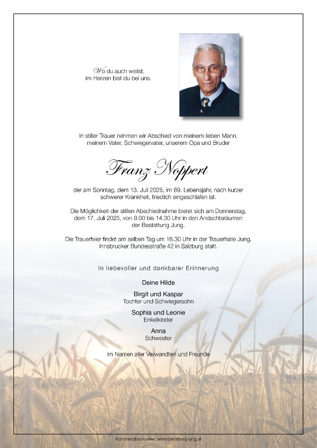 Liebe Hilde mit Familie! Mein herzliches Beileid zum Tod von Franz.Viel Kraft und Zuversicht für die kommende Zeit. Uschi