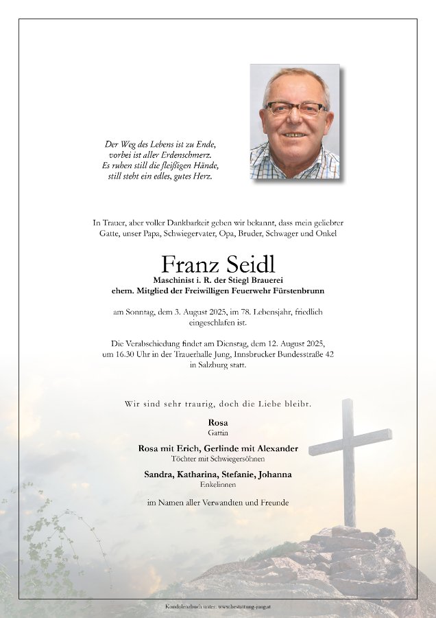 Liebe Trauerfamilie Ich habe die Todesanzeige Eures verstorbenen Vaters zufällig erst jetzt gesehen. Ich wünsche Euch mein aufrichtiges Beileid. Liebe Grüße aus Mattighofen Marianne Schnitzinger