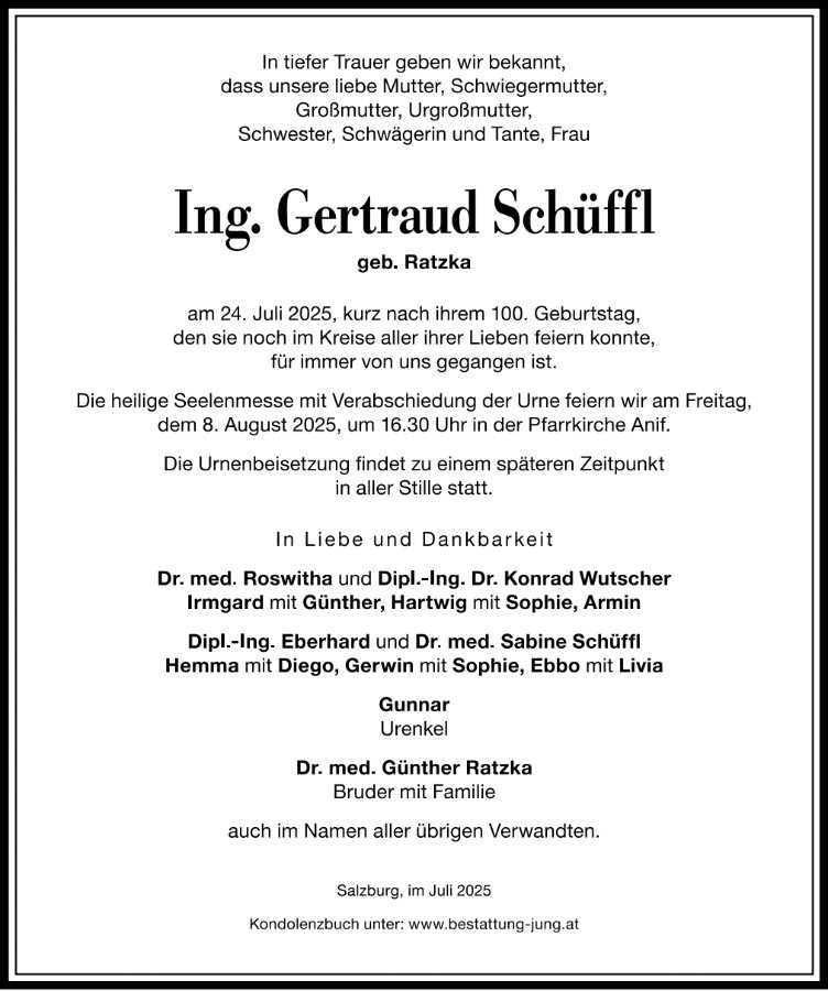 obwohl ein so erstaunliches Alter auch Last sein kann, ist es für uns, die weiterleben, ein großer, unfassbarer Verlust, wenn die geliebte Mutter für immer geht. Ich hoffe, Ihr könnt die Trauer bald durch schöne Erinnerungen zurückdrängen und später ersetzen. Ich denke manchmal an die schöne Freundschaft unserer Eltern und unsere gemeinsamen Wintertage, wohl vor mehr als 50 Jahren. Unser (Wolfgangs und mein) tiefes Mitgefühl möge Euch begleiten. Herzlich, Uki