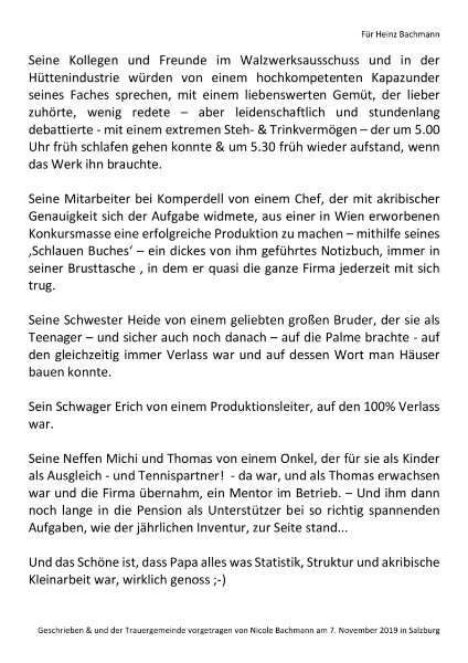 Ich hätte mich heute wirklich gerne von Heinz verabschiedet und wäre sehr gerne nach Salzburg gekommen. Leider haben mir meine Verpflichtungen einen Strich durch die Rechnung gemacht. Ich war aber in Gedanken bei euch. Heinz wird mir immer in Erinnerung bleiben, als ruhiger, lächelnder und vor allem beeindruckender Mann und Vater, der mir immer großen Respekt eingeflößt hat, wenn ich Susi in der Zeisigstraße abgeholt habe. Ich bin sehr dankbar, dass ich ihn zuletzt in der Weinbar im Konzerthaus erleben durfte und mit ihm noch ein gutes Gespräch führen konnte. Dieses Gespräch hat mich deshalb so sehr beeindruckt, weil er wusste, wie es um ihn stand, welchen Weg er gehen wird müssen und mit einer beispielhaften Gelassenheit dies praktisch nebenbei mit ganz wenigen Worten und Gesten zum Ausdruck gebracht hat. Das hat mich sehr berührt und so werde ich ihn auch in Erinnerung behalten, als einen realitätsbezogenen Menschen, der sich um die gesorgt hat, die ihm nahe stehen, all das lautlos aber effektiv und umsichtig.
