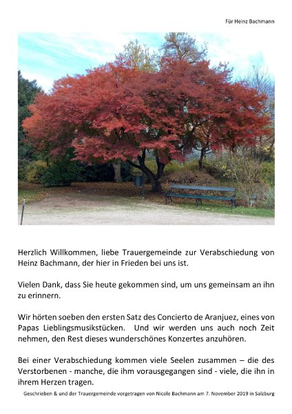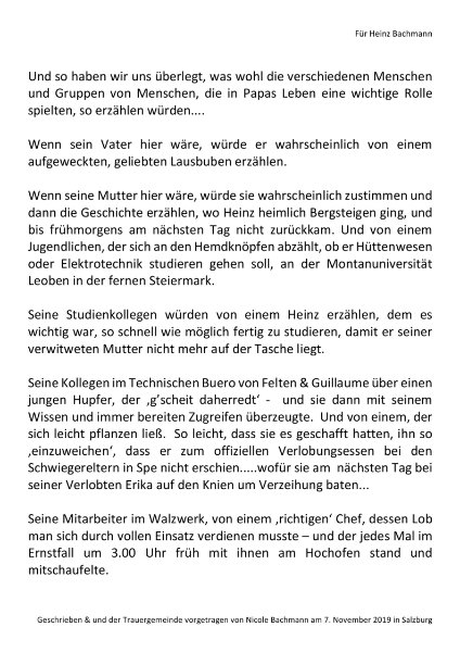 Ich bin in Gedanken bei euch und weiß, dass der Abschied weh tut. Ich hoffe aber, dass ihr auch auf das viele Wunderbare zurückblicken könnt, das ihr mit Heinz erlebt habt. In diesen Bildern und Erlebnissen kann Heinz nicht sterben. Das und der Umstand, dass er sein Leiden überstanden hat, mag vielleicht ein wenig Trost in dieser schweren Stunde sein.