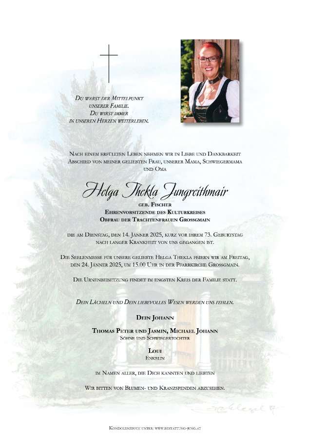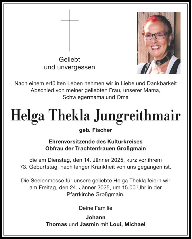 Du warst so viel, liebe Helga Thekla: unübersehbar mit deinen roten Haaren, elegant und würdevoll, der Mittelpunkt der Familie, eine liebevolle Mutter, Ehefrau, und Oma von Loui, engagiert, mutig und ein unendlich feiner Mensch. Eine rote Kerze brennt bei uns zu Hause – ein Licht für deine letzte Reise.