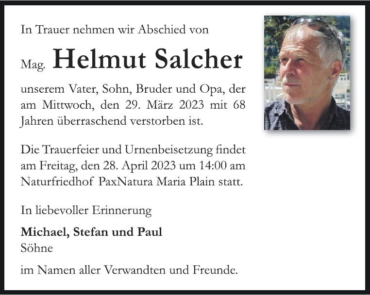 Die Urnenbeisetzung bei PaxNatura in Maria Plain erfolgt am Freitag, dem 28.4.2023, um 14.00 Uhr.