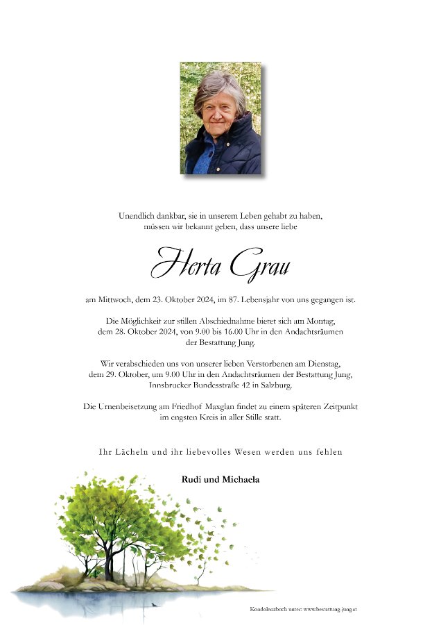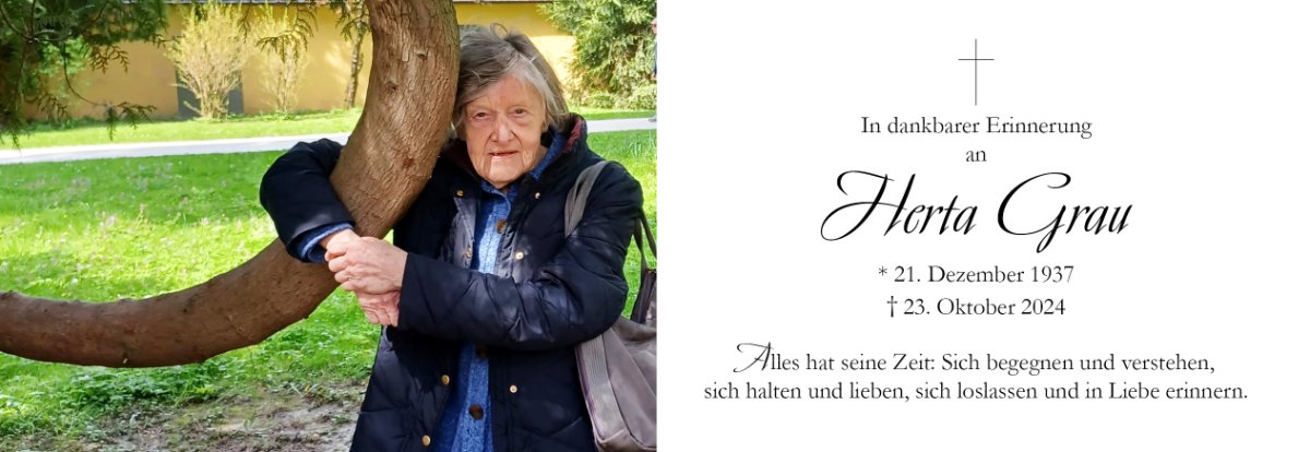In guter Erinnerung nehmen auch ich, aus der Ferne, Abschied von "Tante" Herta Grau, welche mir seit meiner Geburt bekannt ist. Unvergessen bleiben die Erinnerungen mit Ihr und Ihrer lieben Mutter, unserer Margit-Tant; gerade auch in unserer Versammlung, der ETG-Rif. Jahrzehnte lang besuchten sie die Gottesdienste. Unvergessen bleibt die Freundschaft von Herta zu unserer Mutter Tinka und unserem Vater Philipp und unseren Tanten Resle aus Linz und Leni auf Rif. Sozusagen gehörte Herta zum "erweiterten" Familien- und Freundeskreis. Wir wollen glauben, dass ihr Glaube an Gott sie bis zuletzt erfüllt hat. Ihre stets freundliche Begrüßung bei meinen Besuchen in Salzburg fehlen mir. Christian Haas.