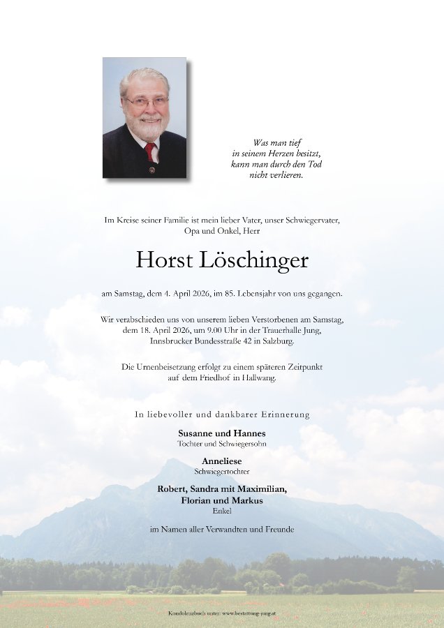 Lieber Herr Löschinger, ich wünsche Ihnen eine gute Reise und ihrer Familie mein aufrichtiges Beileid.Angelika ( Austro-Hahn)