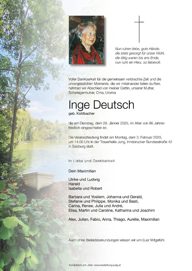 Liebe Trauerfamilie! Wir möchten unser aufrichtiges Beileid zum Tod eurer geliebten Mutter ausdrücken.Jäger Charlotte, Jutta und Lotte