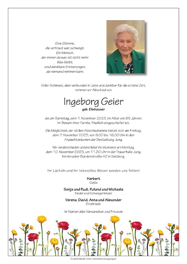 Liebe Inge, erst jetzt habe ich von deinem Ableben erfahren und war geschockt. Danke für die Zeit, die wir in direkter Nachbarschaft verbringen durften, Du warst wie eine zweite Mama zu mir. Ruhe in Frieden und nun wieder mit deinem Herbert vereint.