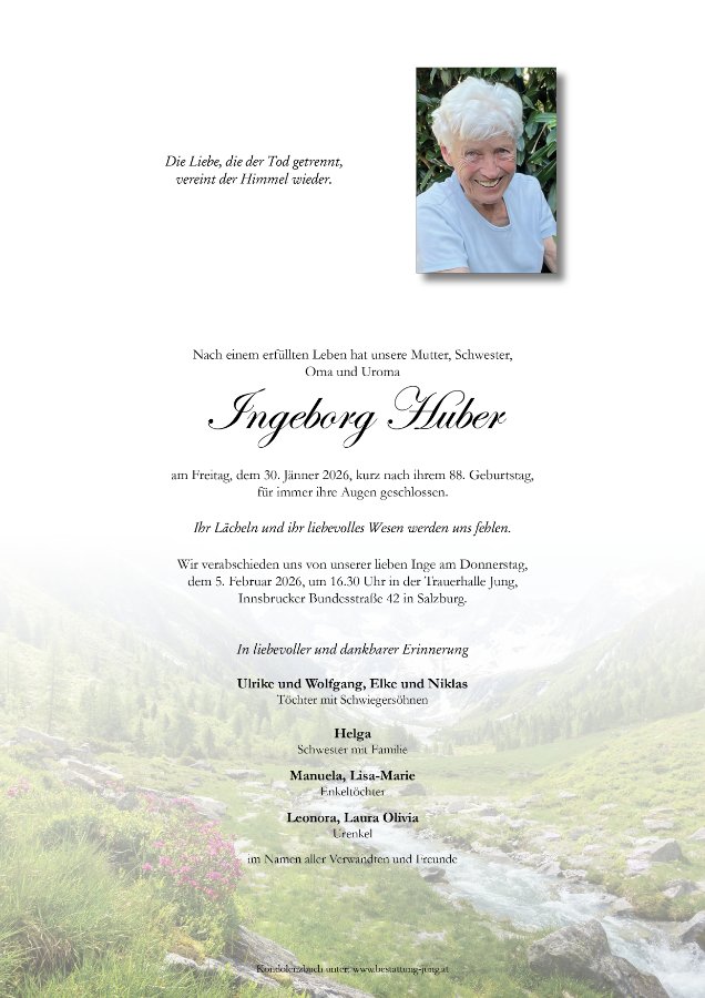 Ich bin sehr dankbar, dass ich die liebe Inge kennenlernen durfte und bin mir sicher, dass sie jetzt bei ihrem geliebten Sepp, eurem Papa und Opa, ist und gemeinsam mit ihm über euch wacht.