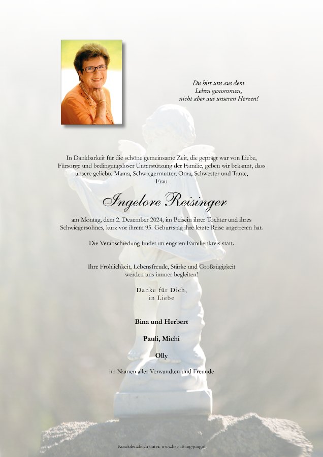 Liebe Frau Reisinger! Sie Waren eine bewundernswerte und sehr liebevolle Kundin. Wir haben mit ihnen auch sehr wertvolle Gespräche geführt und möchten uns bedanken. Wir wünschen Ihnen auf Ihrer letzten Reise alles Gute. Ihr Team Salon Haare