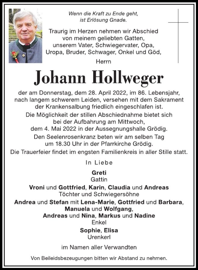 Liebe Cousine Greti und FamilieUnser herzliches Beileid zum Tod vom HansiAuch wenn sein Tod Erlösung war tut es trotzdem immerweh. Ossi und Gitti