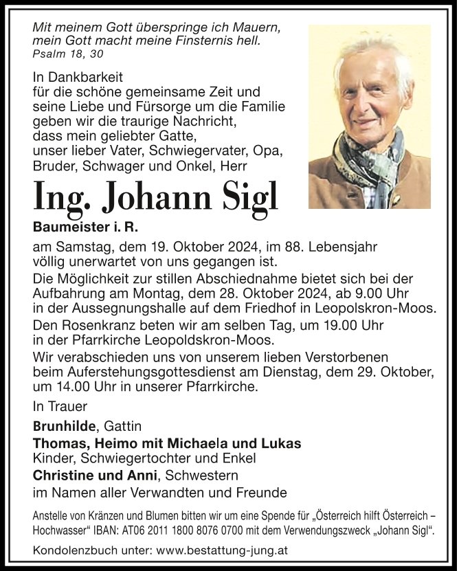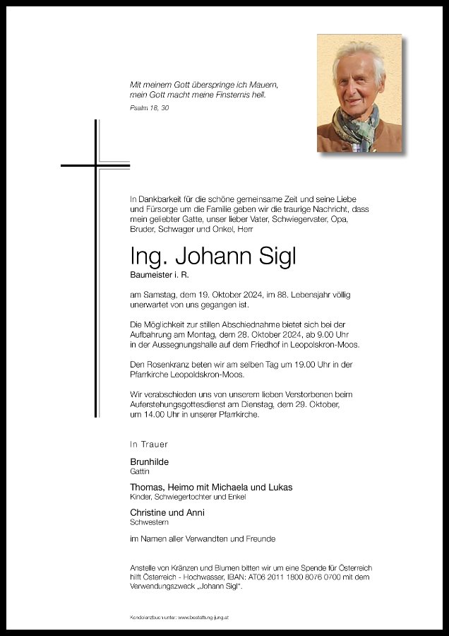 mit großer Trauer haben wir vom Verlust von Herrn Bmstr. Ing. Johann Sigl erfahren. Als langjähriger Mitarbeiter und Geschäftsführer der Hartl Bau war er nicht nur eine prägende Persönlichkeit innerhalb unseres Unternehmens, sondern auch ein geschätzter Kollege für viele von uns.