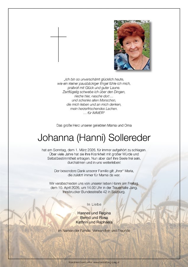 Ich darf mich für die wunderschöne Parte herzlich bedanken. Diese spiegelt das positive Wesen von Hanni so wunderbar wieder.