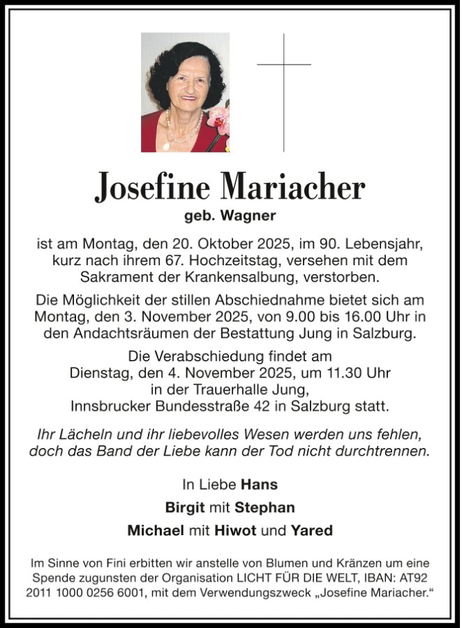 Liebe Frau Mariacher, ein Licht für Ihre letzte Reise. Lieber Herr Mariacher, mein aufrichtiges Beileid zum Verlust Ihrer geliebten Frau.