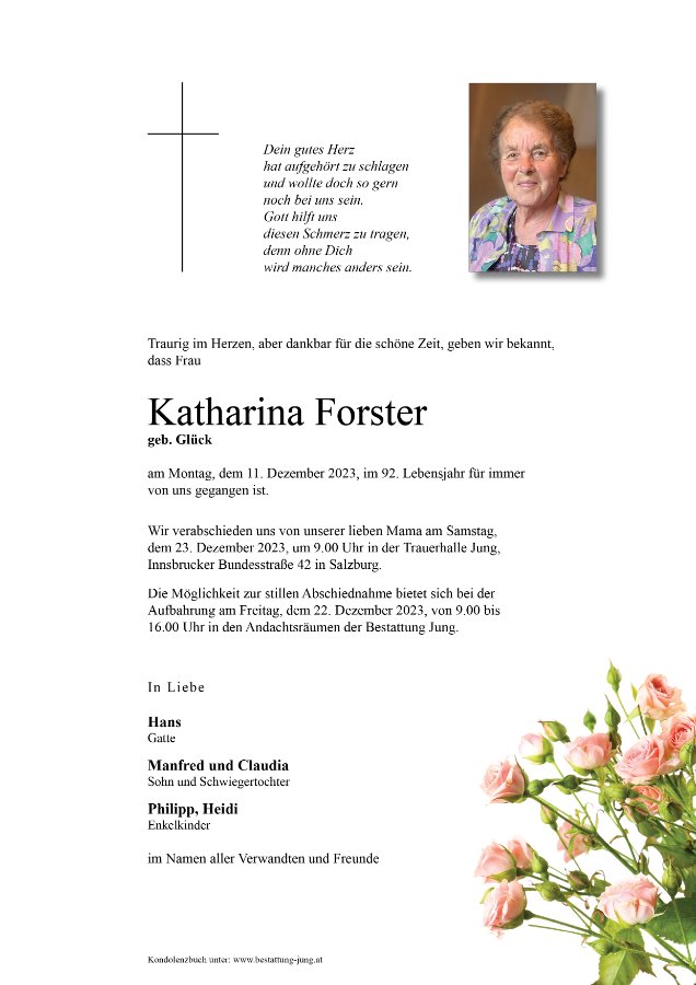 Aufbahrung am Freitag, dem 22. Dezember 2023, von 9.00 bis 16.00 Uhr in den Andachtsräumen der Bestattung Jung, Innsbrucker Bundesstraße 42 in Salzburg.