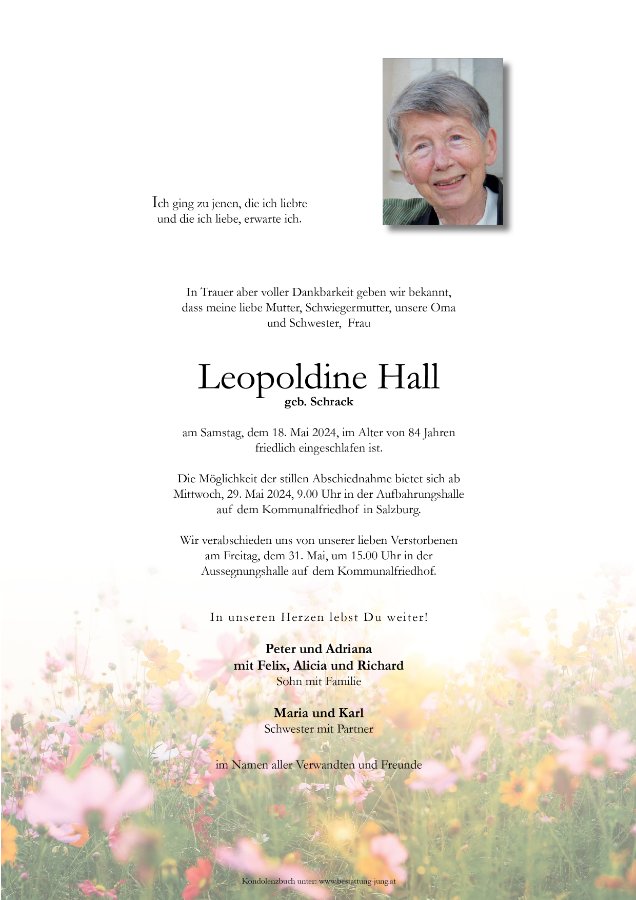 Die Möglichkeit der stillen Abschiednahme bietet sich bei der Aufbahrung ab Mittwoch, 29.5.2024, 9.00 Uhr in der Aufbahrungshalle auf dem Kommunalfriedhof in Salzburg.