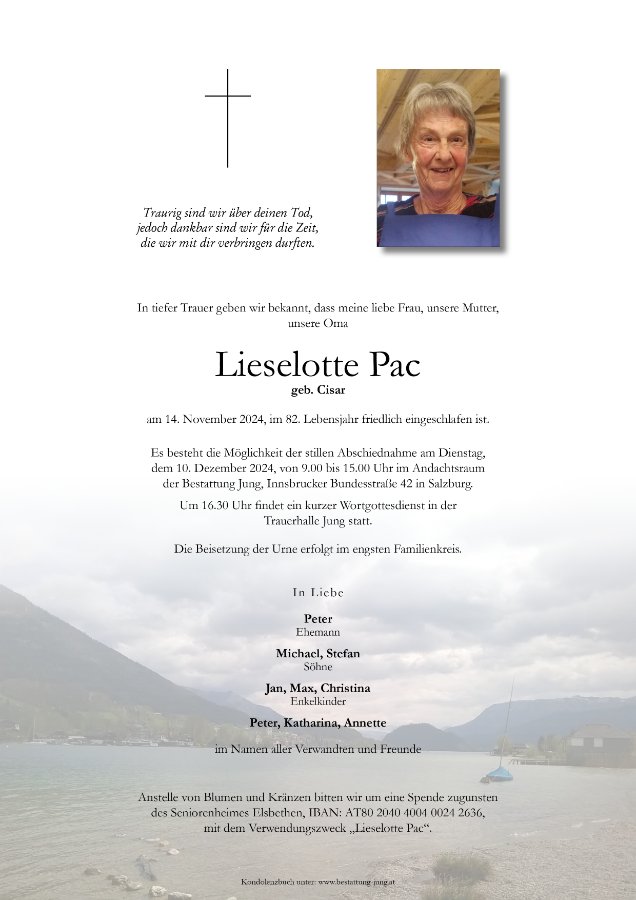Ich werde mich immer sehr gerne an Liesi erinnern und immer wieder eine Kerze bei uns in der Kirche für Liesi anzünden und ihrer gedenken!