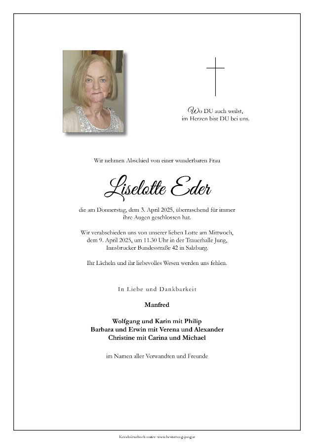 Durch einen Zufall habe ich vom Tod Ihrer Mutter erfahren und möchte Ihnen allen mein herzliches Beileid aussprechen.