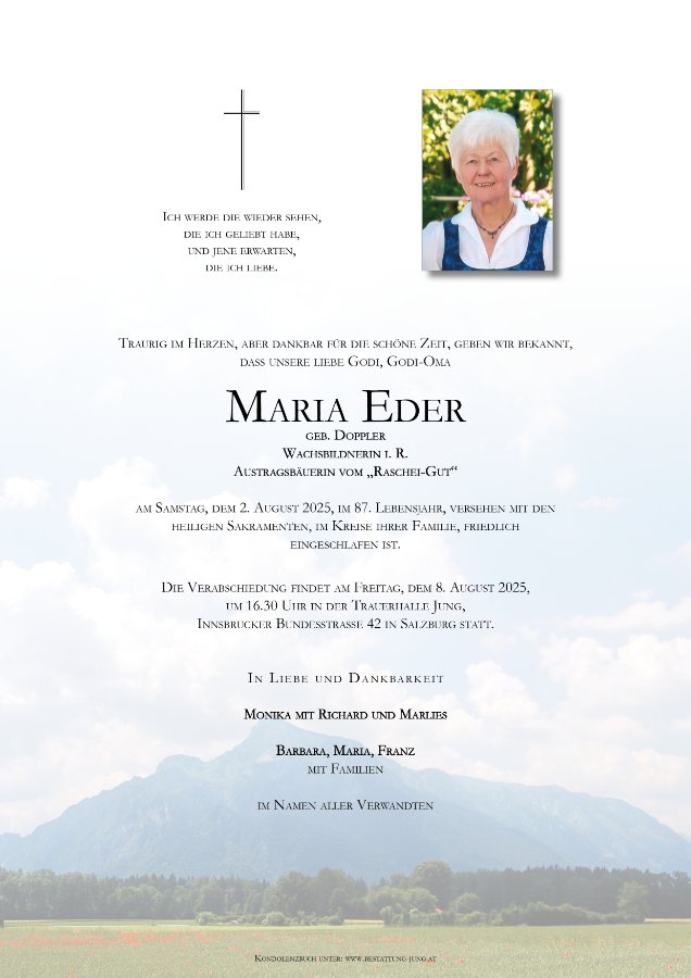 Der Tod ist nicht das Ende, nicht die Vergänglichkeit, der Tod ist nur die Wende, Beginn der Ewigkeit. Was uns bleibt, sind Liebe, Dankbarkeit und Erinnerung. Der Tod ist die Grenze des Lebens, nicht aber die Liebe. Ihre Schritte sind verstummt, doch die Spuren ihres Lebens bleiben.