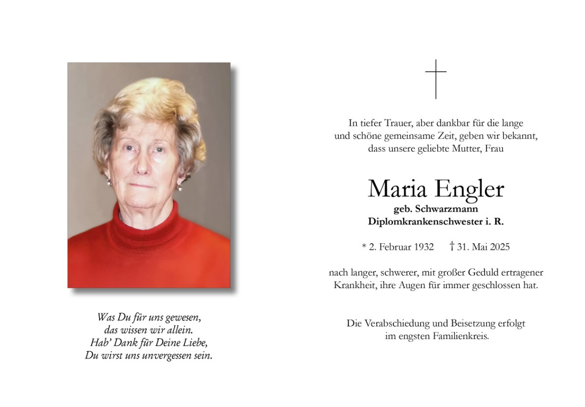 Meine Aufrichtige ANTEILNAHME und mein Herzlichstes Beileid zum Ableben Eurer Mutter. Ihr Leidensweg schmerzvoller Weg hat nun ein Ende.. Alles Gute für Euch in der traurigen Zeit.