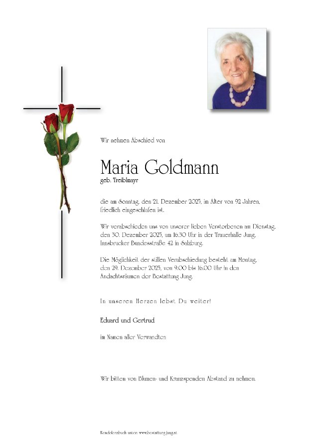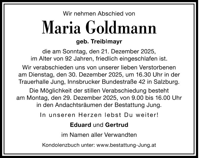 Liebe Frau Goldmann, ruhen Sie in Frieden.. auch im Namen meiner Mutter Christine, einer Tischnachbarin im Seniorenheim Wals.