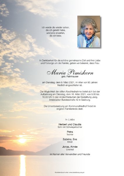 Die Möglichkeit der stillen Abschiednahme bietet sich bei der Aufbahrung am Dienstag, dem 16. März 2021, von 9.00 bis 16.00 Uhr in den Andachtsräumen der Bestattung Jung, Innsbrucker Bundesstraße 42 in Salzburg.