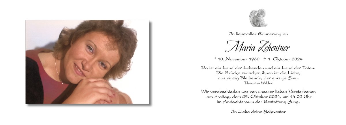 Es tut uns unendlich leid, dass die letzten Jahre Deiner Schwester Maria durch lange Krankheit erschwert wurden. Wir haben erst kürzlich davon gehört und danken Dir, Margit, für Deine aufopfernde Pflege. Wir wünschen Dir Stärke, Frieden und Trost. Mit aufrichtiger Anteilnahme,