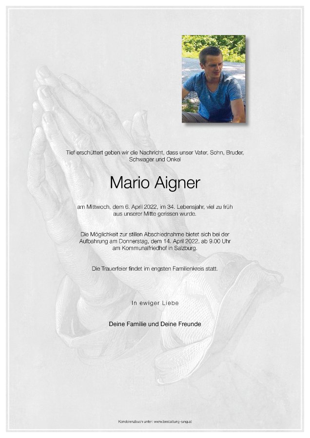 Wenn ein geliebter Mensch aus der Familie stirbt, lässt sich der Schmerz oft kaum ertragen. Wir fühlen uns hilflos und wir können nichts tun, um Ihn wieder zum Leben zu bringen. In so einer Situation gibt uns die Bibel echten Trost. Hiob, ein treuer Diener Gottes, glaubte fest an die Auferstehung. Er fragte: „Wenn ein Mensch stirbt, kann er wieder leben?“ Dann sagte er zum Schöpfer: „Du wirst rufen und ich werde dir antworten. Nach dem, was deine Hände geschaffen haben, wirst du dich sehnen.“ Hiob wusste also, dass sich Gott sogar darauf freut, die Toten aufzuerwecken (Hiob 14:13-15). Was darf demnach der Mario erwarten? In der Vergangenheit lebten die Auferstandenen wieder auf der Erde bei ihrer Familie und ihren Freunden. So wird es auch in Zukunft sein, nur noch viel besser: Den Auferstandenen steht in Aussicht, für immer auf der Erde zu leben (Psalm 37:29). Sie werden nie mehr sterben müssen (Offenbarung 21:3-5). Und das Leben wird dann ganz anders sein, als wir es heute kennen. Es wird keinen Krieg, keine Verbrechen und „keine Krankheiten“ mehr geben (Jesaja 33:24). Das, und noch mehr an sehr wünschenswerten Veränderungen verspricht unser Schöpfer in seinen Buch, die Bibel. Mögen Euch diese begeisternden Wahrheiten in Eurer Trauer, Trost, und Hoffnung auf ein Wiedersehen geben!