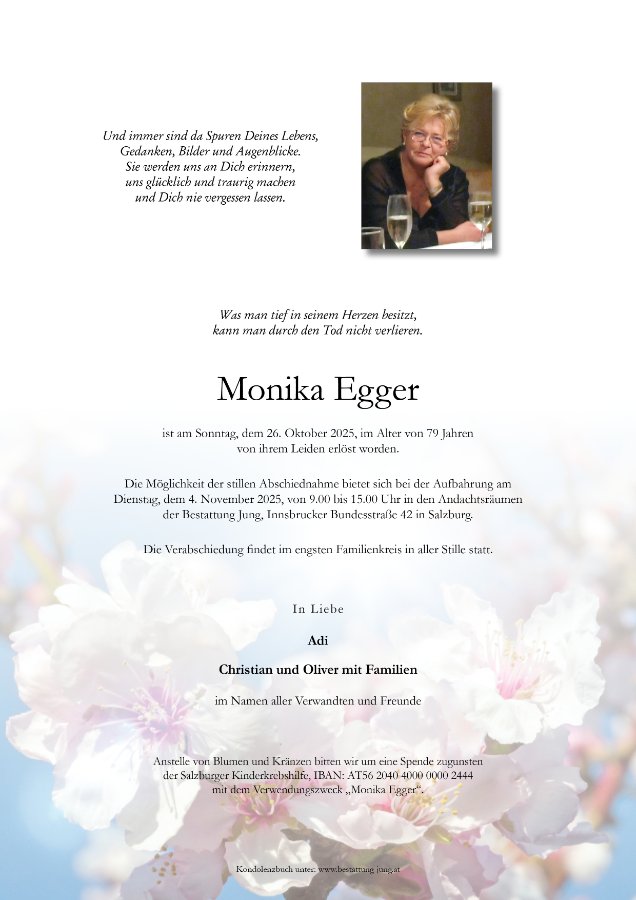 Lieber Adi, Christian, Oliver, Dagmar, Hedi und alle Enkelkinder Ich vermisse die Fröhlichkeit und das herzliche Lachen von Monika ! Ich trage sie liebevoll in meinem Herzen.............