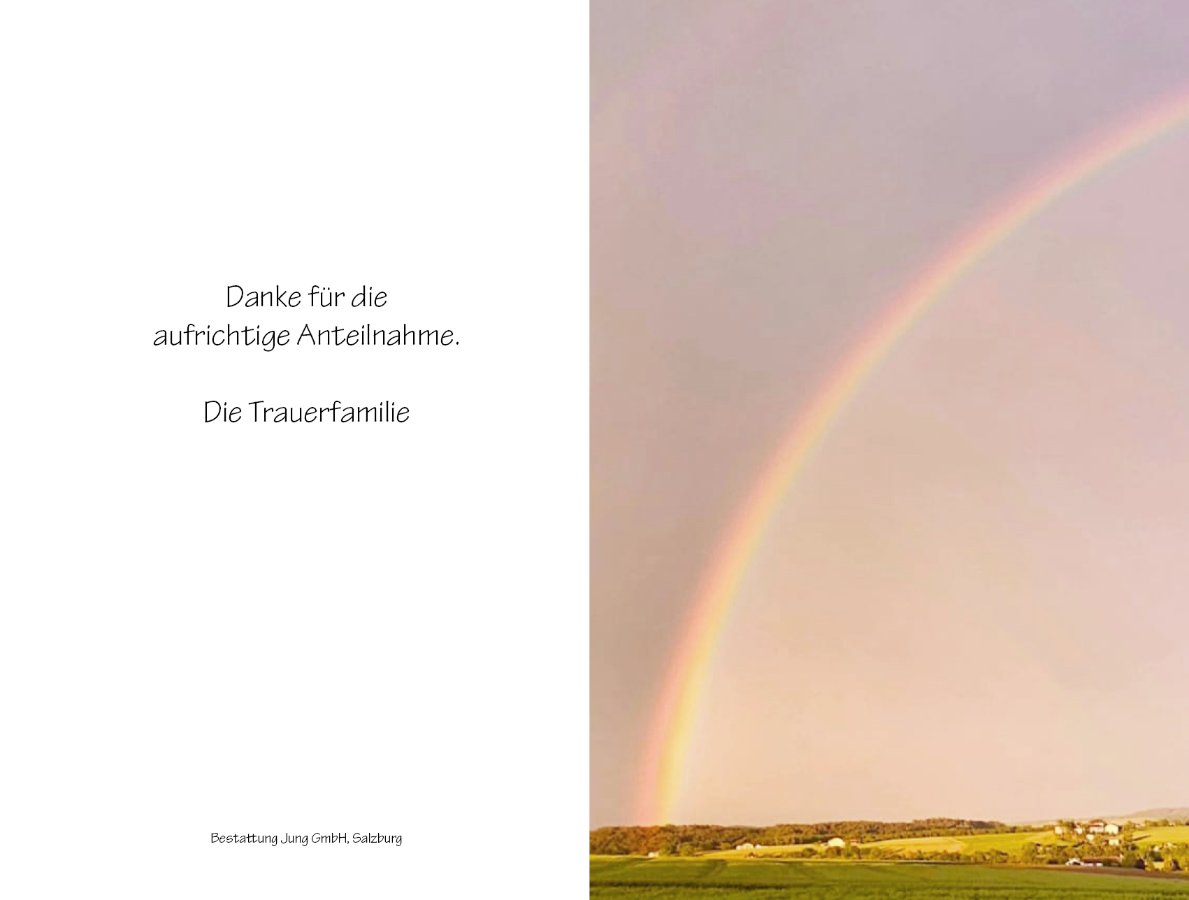 Die Möglichkeit zur stillen Abschiednahme bietet sich bei der Aufbahrung am Donnerstag, dem 11. Juli 2024 von 9.00 bis 16.00 Uhr in den Andachtsräumen der Bestattung Jung, Innsbrucker Bundesstraße 42 in Salzburg.