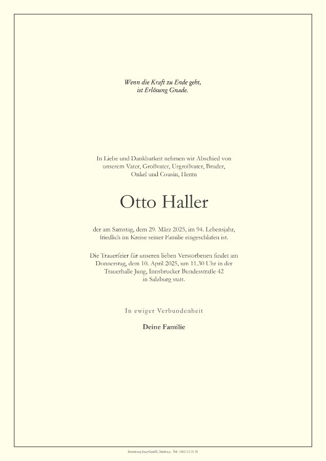 Sending our sympathy on the passing ofOtto Haller; a good man of substance.Rest in peace!
