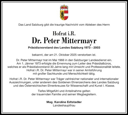 Die Fachgruppe Präsidium beim Amt der Salzburger Landesregierung nimmt in stiller Trauer Abschied von Herrn Hofrat iR Dr. Peter Mittermayr, der unsere Dienststelle von 1973 bis 2003 über 30 Jahre hindurch als Präsidialvorstand geleitet hat.