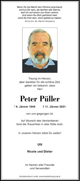 Liebe Ulli! Sehr betroffen von der Nachricht über das plötzliche Ableben von Peter, ist es schwer, richtige Worte zu finden, die Deinen Schmerz und Deine Trauer lindern könnten. Aber es tut sicherlich gut, zu wissen, wieviele Menschen Peter sehr geschätzt haben! Viel Kraft für Dich- in Gedanken sind wir bei Dir! Claudia und Franz