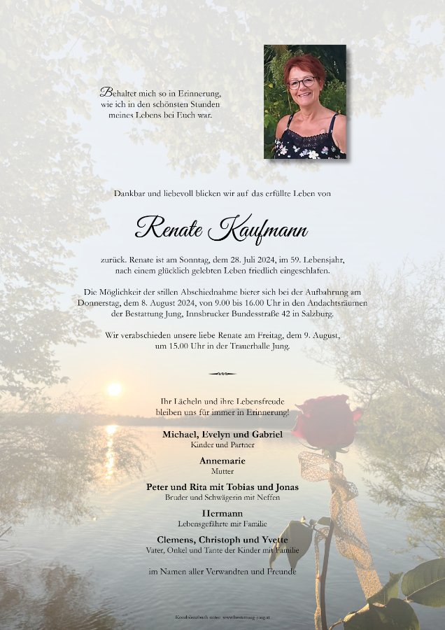 Die Möglichkeit der stillen Abschiednahme bietet sich bei der Aufbahrung am Do. 8. August von 9.00 bis 16.00 Uhr in den Andachtsräumen der Bestattung Jung.