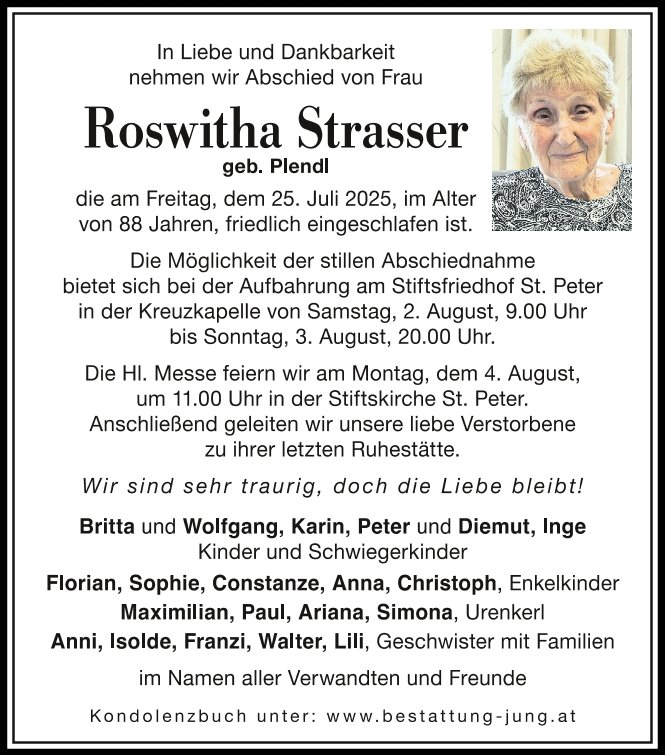 Ein befreundeter Priester brachte den Salzburger Radiologen Dr. Erich Strasser in das gastfreundliche Haus von Roswithas Eltern. Erich und Roswitha kamen sich näher und heirateten 1957. 1959 gingen die beiden mit der einjährigen Britta zurück nach Salzburg. Roswitha, die doch so gerne Kinderkrankenschwester war, fand eine neue Aufgabe als Röntgenassistentin in der Praxis ihres Mannes. Ihre Bestimmung im Leben, die sie erfüllende Aufgabe aber fand sie in ihrem Dasein als Mutter und Ehefrau.