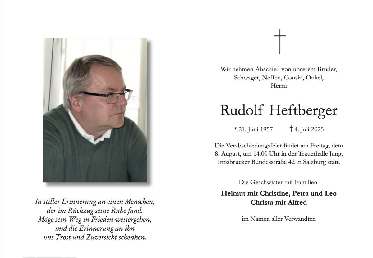 Lieber Rudi, ich habe erst jetzt in der PV intern von deinem leider viel zu frühen Ableben erfahren. Ich werde dich stets als ruhigen, netten und hilfsbereiten Arbeitskollegen, mit dem ich gerne immer wieder nette Gespräche geführt habe, in bleibender Erinnerung behalten. Den Angehörigen übermittle ich nachträglich meine herzliche Anteilnahme. Ruhe in Frieden lieber Rudi.