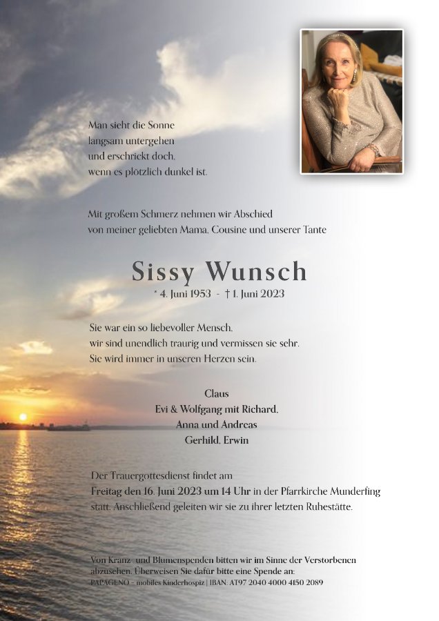 Liebe Sissy, die Nachricht von deinem Tod hat mich sehr getroffen und zutiefst traurig gemacht. Ich hab deine Stimme noch im Ohr, wenn wir telefoniert haben und kann es nicht glauben, dass wir einander im vergangenen Winter bei eurem Besuch bei uns das letzte Mal gesehen haben. In der Zwischenzeit hat es immer wieder SMS, mit lieben Wünschen von dir zu einem Anlass oder einfach nur zu einem guten Tag gegeben. Iich habe viele schöne Erinnerungen an dich, aus unserer Kindheit,aber auch von später und bin dankbar,dass wir über all die Jahre einander verbunden geblieben sind. Ich habe dich als liebevollen und warmherzigen Menschen erlebt und so wirst du mir in Erinnerung bleiben. Ich wünschte,liebe Sissy, ich könnte dir das einfach bei einem "nächsten Mal" selber sagen......so sind es nur meine Gedanken an dich......... Herzlich Lucia