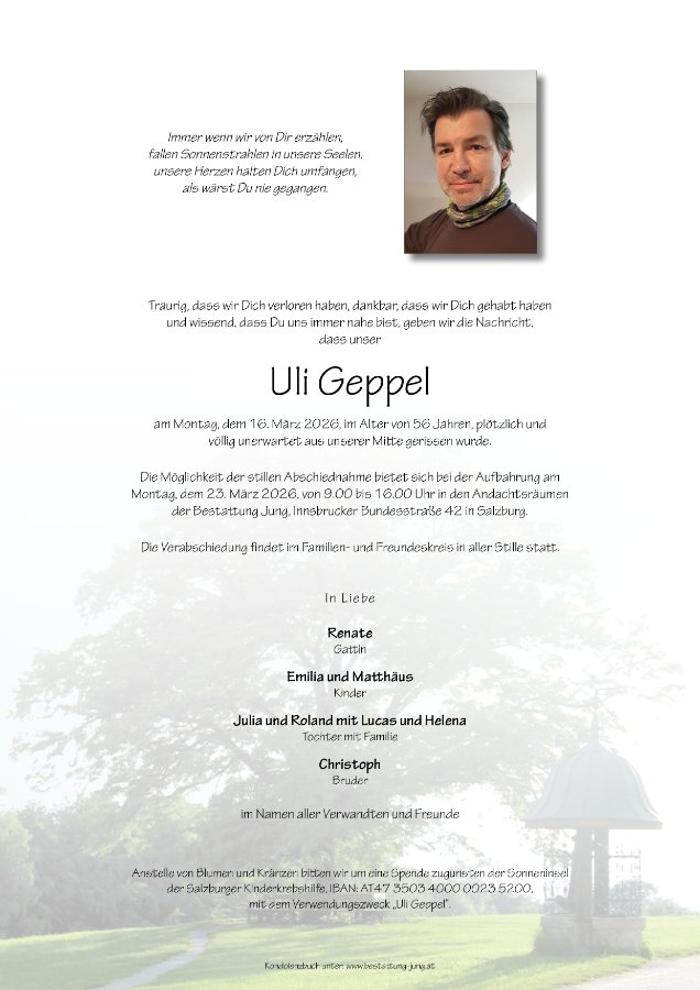 Unfassbar müssen wir zur Kenntnis nehmen, dass unser lieber Uli, nicht mehr da ist. Wir können nicht mehr mit ihm lachen, diskutieren, seinen Rat einholen, seine Kochkünste genießen oder ein Achterl mit ihm trinken, um unser Leben, unser Glück zu teilen 💞 Es ist unbegreiflich! Warum? Uli hatte nicht dich alleine geheiratet, sondern deine ganze Familie, liebe Renate! UND: Uli hat das sehr genossen!