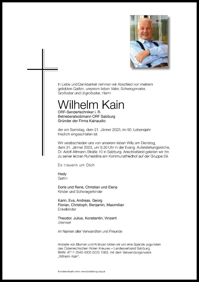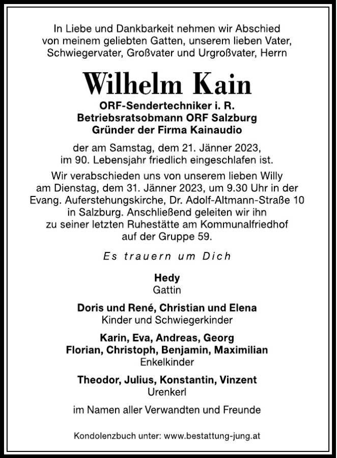 Ein langes und erfülltes Leben ist zu Ende gegangen. Gerne denke ich an die sehr angenehme Zusammenarbeit mit Herrn Kain im HIFI Stereocenter Kain in der Rainerstrasse. Seine menschliche und fachliche Kompetenz war inspirierend und vorbildlich.